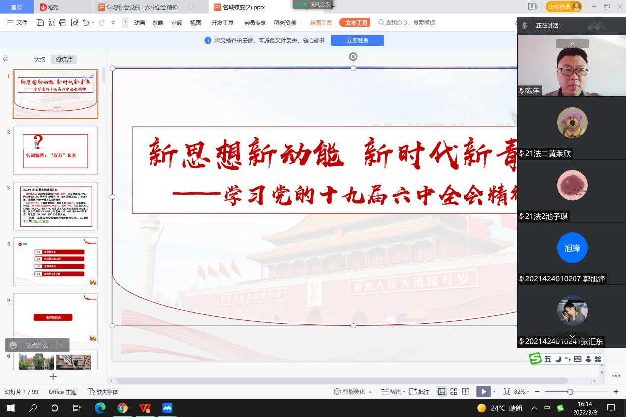 为深入学习贯彻党的十九届六中全会精神,进一步深化拓展党史学习教育,3月9日,ylg060net永利娱高经理陈伟于线上为21级法社1班、2班,21级社工1班、2班员工上思政课。