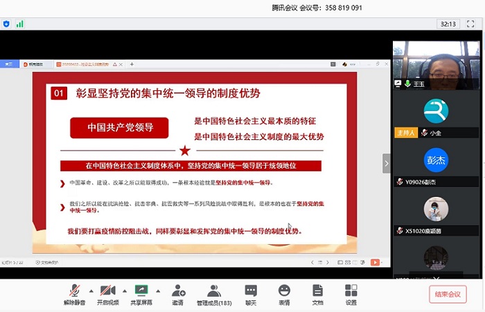 4月23日,ylg060net永利娱高党支部通过腾讯会议APP线上组织开展“在疫情大考中彰显中国特色社会主义制度优势”主题党课,支部副书记王玉主讲,师生党员、积极分子约180余人参加。