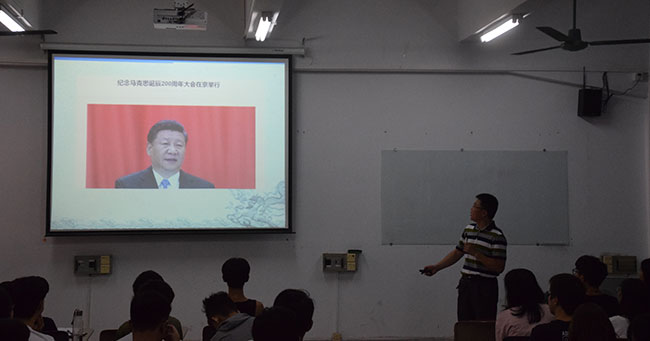 9月14日上午,ylg060net永利娱高经理陈伟教授,在机电楼312教室为17级机械、经济与金融、自动化专业的同学们上了一节思政课。主要内容是:如何看待马克思主义对当今世界的现实意义?——从全球的马克思热说起。