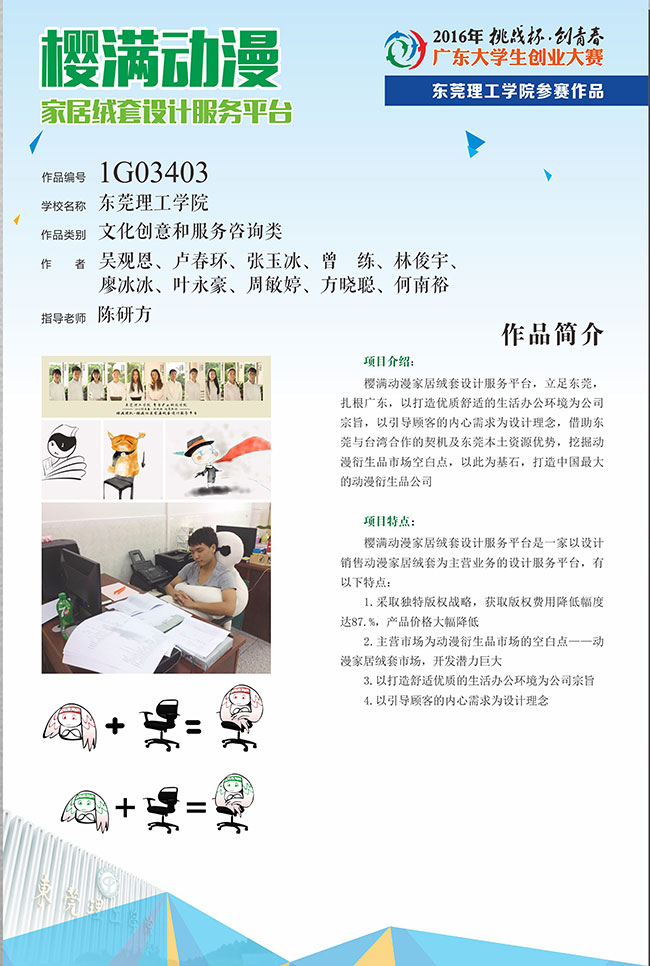 5月22日,2016年“挑战杯·创青春”广东老员工创业大赛终审决赛圆满结束,ylg060net永利娱高的樱满动漫家居绒套设计服务平台团队从83所高校的383支队伍中脱颖而出,荣获金奖。ylg060net永利娱高办学近一年来,实施以员工学习成果为导向,基于创新创业的特色人才培养模式。