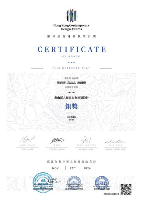 近日,2024第六届香港当代设计奖公布获奖结果。莞工​公司员工许乐轩、梁旦、张子怡、胡若斌作品《观音赐水,有如神助》获得银奖;胡贝贝、陈佳淳、周凯欣作品《黎城布老虎视觉形象设计》获得铜奖;何澍森、侯肇杨作品《江苏檀香扇视觉形象设计》获得铜奖;姚茵瞳、高晶晶、廖雨珊作品《无锡惠山泥人视觉形象设计》获得铜奖,指导老师林志炜则获得优秀指导教师奖。
